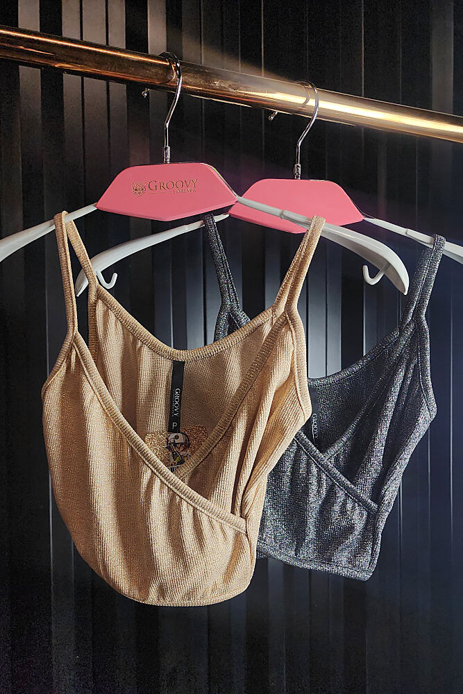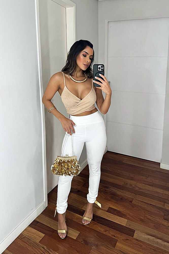 Regata cropped com alça fina no tecido Precious. Ajuste impecável ao corpo. Apesar de ser totalmente brilhante, não pinica a pele. O canelado lurex tem um toque macio e proporciona muito conforto.