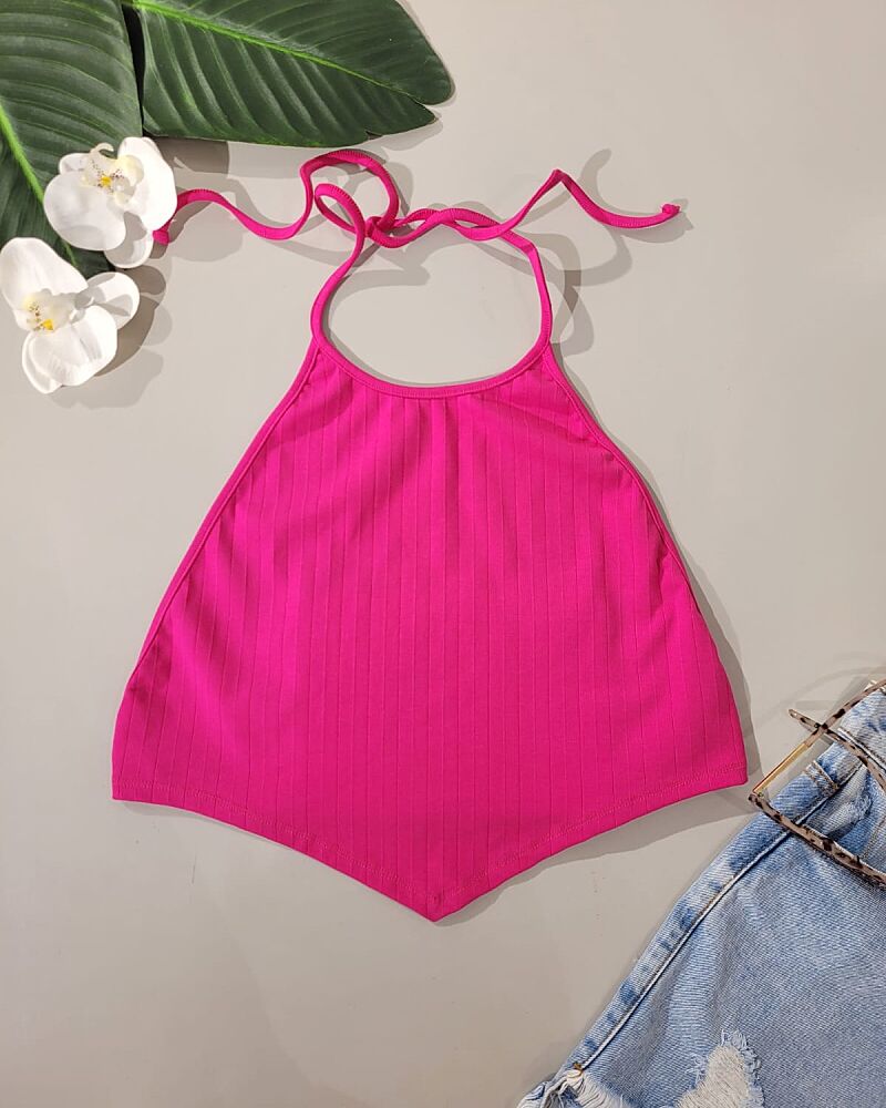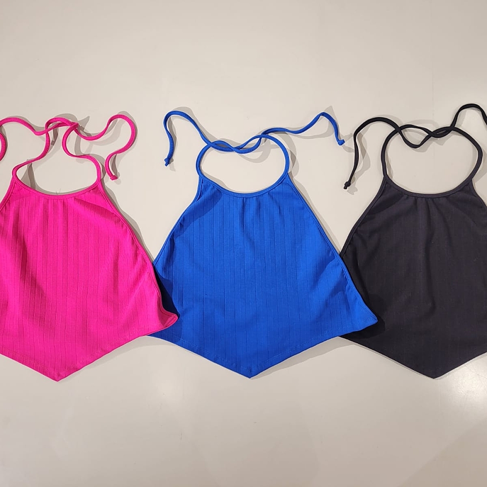 SH - Top confeccionado em malha canelada bali, modelo frente unica, com amarração no pescoço e costa, barra forma um V na frente. Busto P veste 36/38 M veste 40 G veste 42/44 Modelo veste P