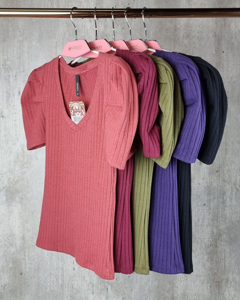 SH Blusa manga curta em malha canelada de algodão e gola v. Manga princesa. Busto P 40/42 M 44 G 46
