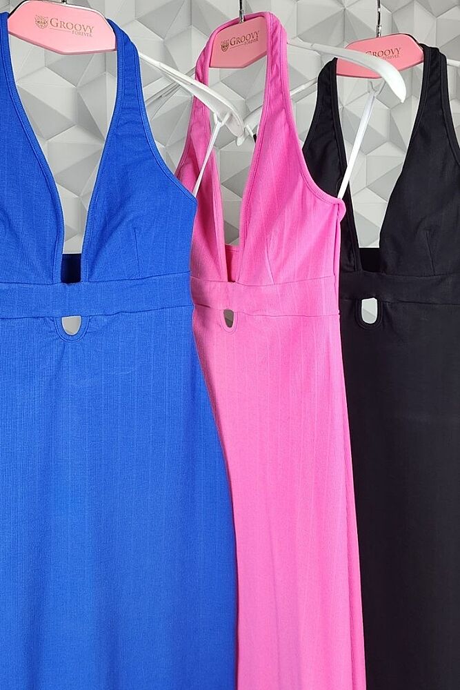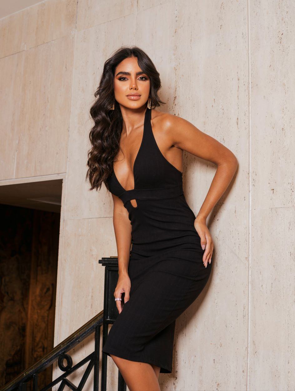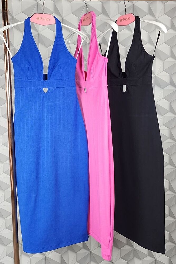 Vestido confeccionado em malha canelada dream (power), modelo decote V, frente unica, possui comprimento midi, e abertura nas costas. Manequim P veste 36/38 M veste 40 G veste 42 Modelo veste P