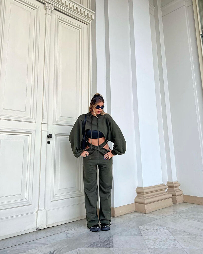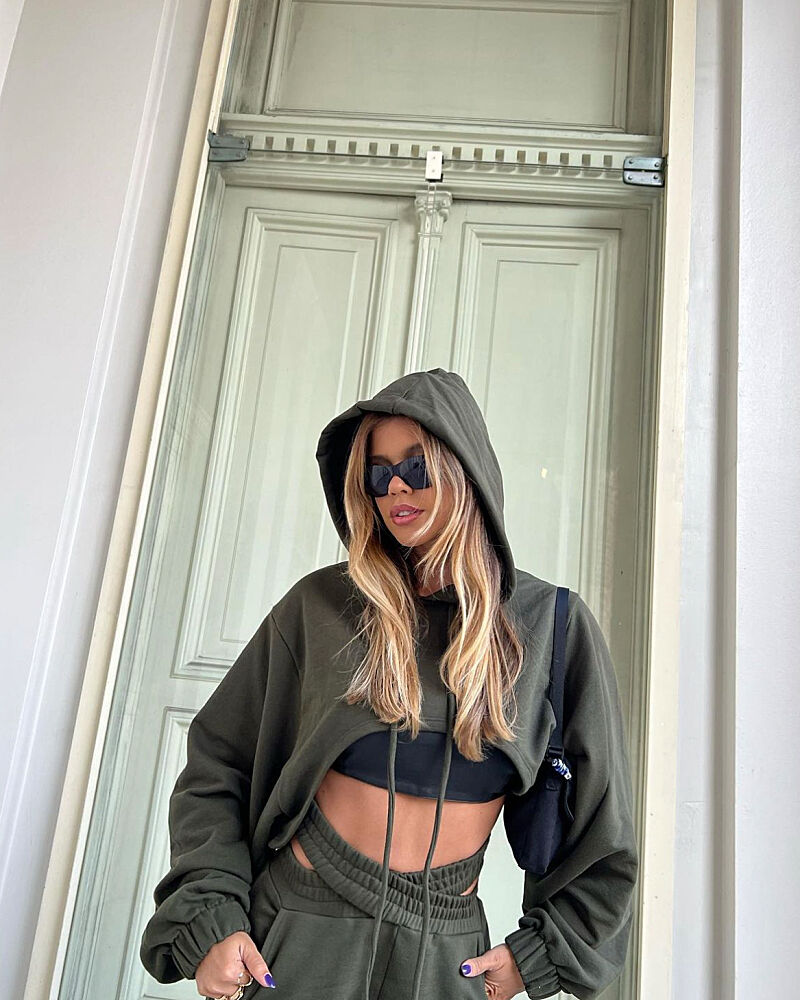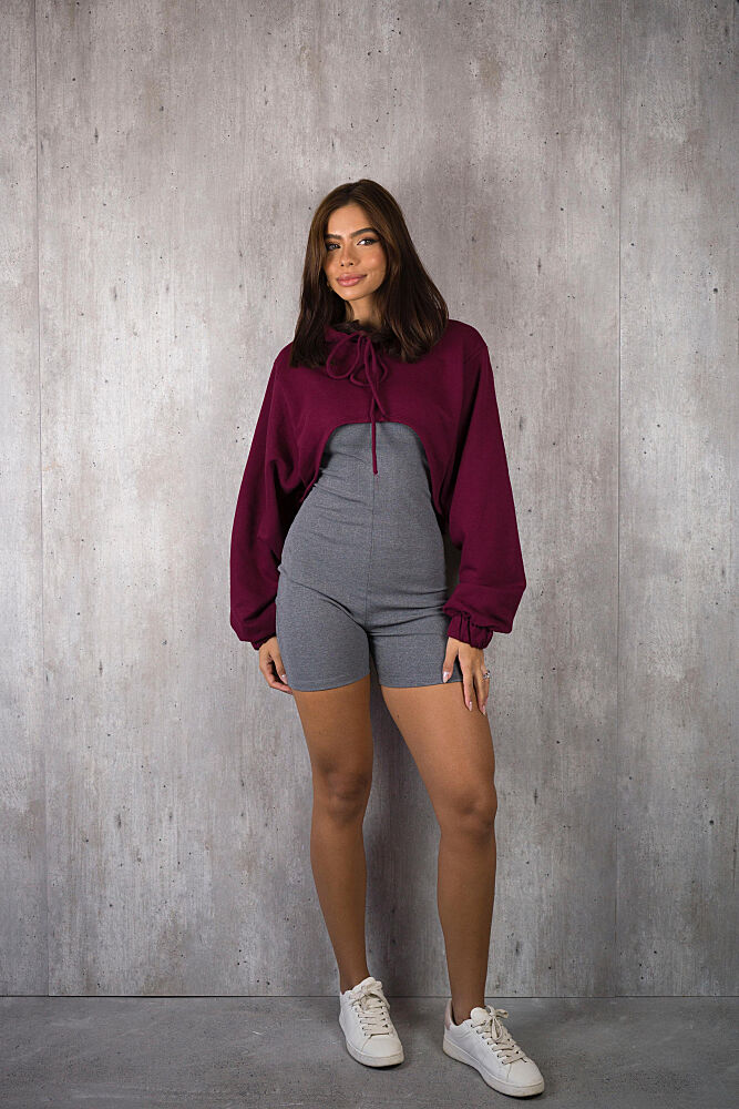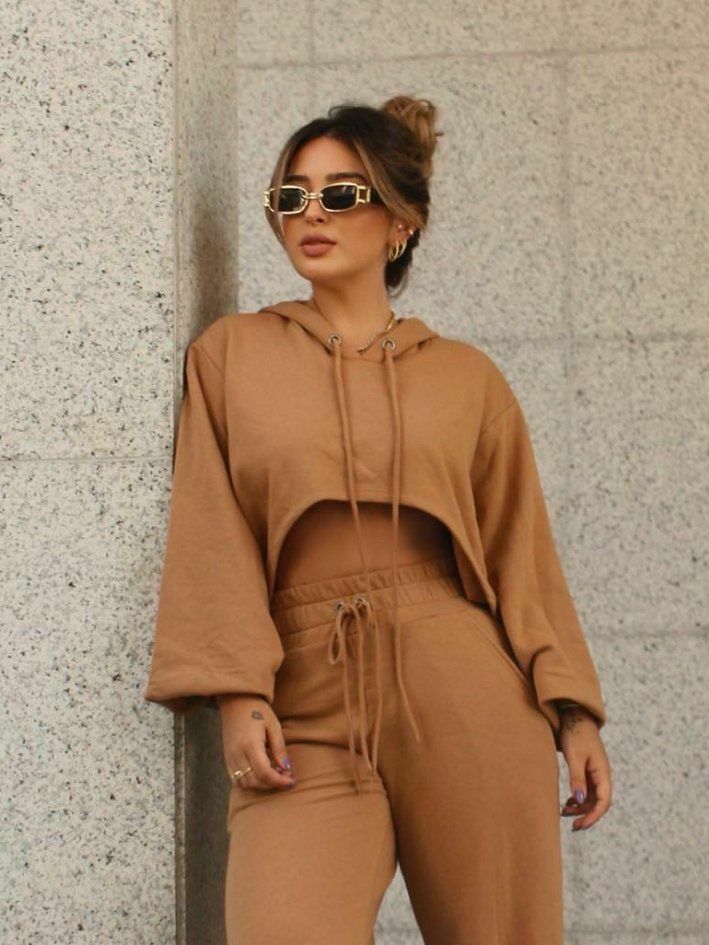 Cropped manga longa em moletom com capuz e parte da frente mais curta. Modelagem soltinha. Busto P 38/40/42 M 44 G 46 Modelo veste P